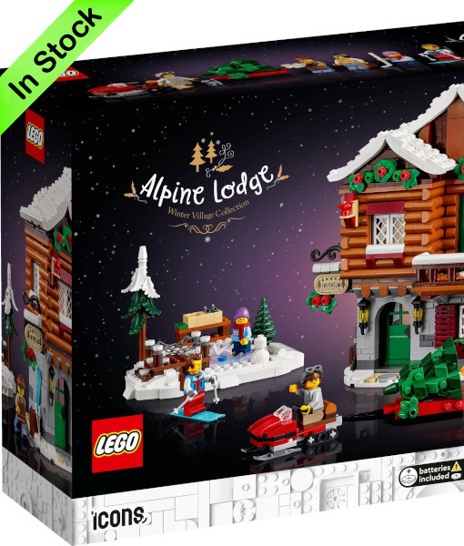 Le caratteristiche esterne includono un negozio di legna, un box per gli sci, un’area di pattinaggio e cabina-WC, più una motoslitta, un albero di Natale, 5 LEGO Minifigure e uccelli, gatti e scoiattoli.