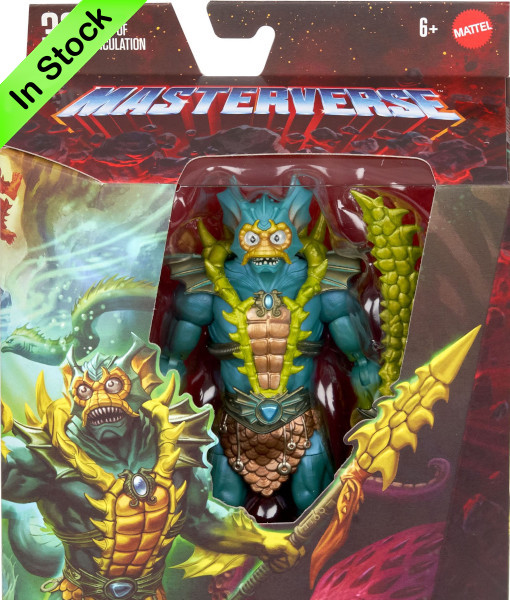 Mer-Man measures approx. 18 cm and comes in a window box packaging. He has about 30 points of articulation so they’re highly poseable for imaginative and action-oriented fun, MOTU style, interchangeable hands and trademark battle accessories.